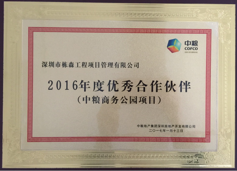 中糧地產(chǎn)集團(tuán)深圳房地產(chǎn)開發(fā)有限公司2016年度優(yōu)秀合作伙伴 |
