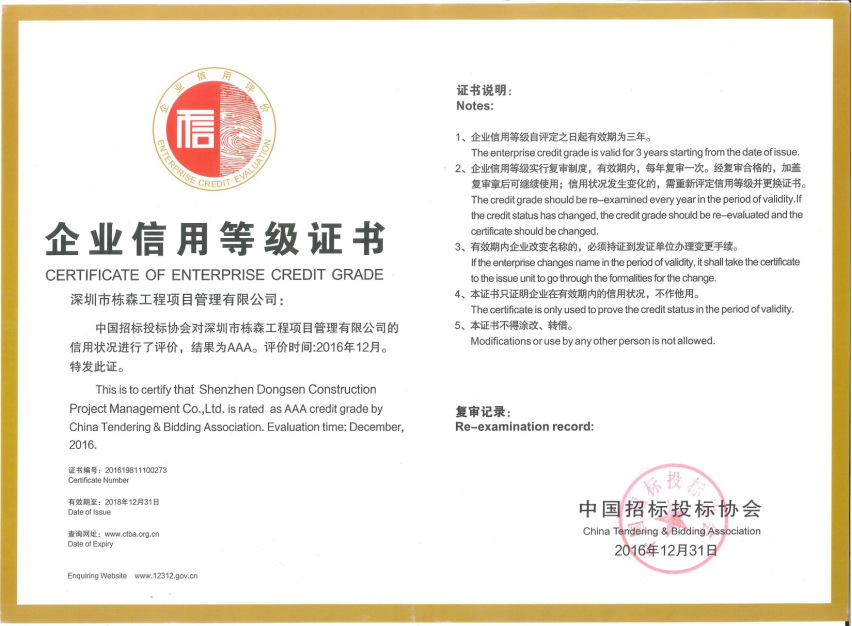 中國招標(biāo)投標(biāo)協(xié)會企業(yè)信用等級AAA |