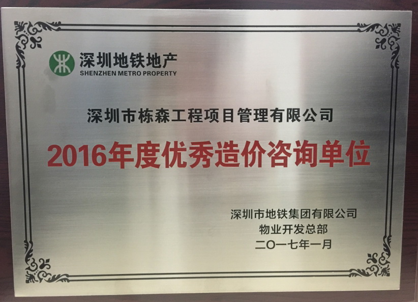 深圳市地鐵集團(tuán)有限公司物業(yè)開發(fā)總部2016年度優(yōu)秀造價(jià)咨詢單位 |
